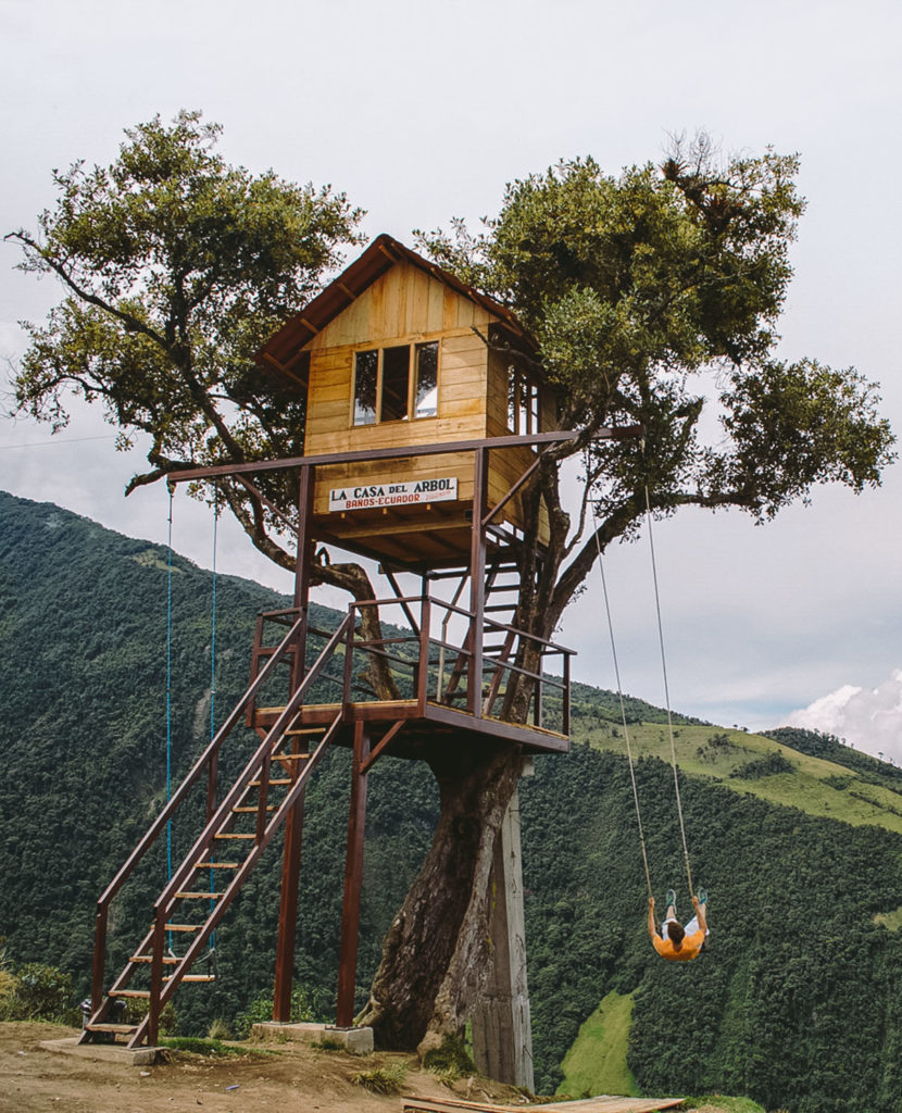 La Casa del Arbol, also known as the Swing at the End of the World, is a seismic monitoring station 2,600 meters (8,530 feet) above sea level overlooking the active volcano, Mt. Tungurahua. The swing is part of a small park at Casa de Arbol, which has three swings and a small zip line. Travelers of all ages are welcome to take a ride on the swing at the end of the world. There are guides within the park to help travelers buckle in and push you as you swing.