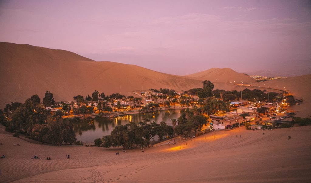 Huacachina is a village built around a small oasis and surrounded by sand dunes in southwestern Peru. This oasis was formed due to an underground current of water, which generated the growth of plants and trees in the middle of the Ica desert. Huacachina has a permanent population of around 100 people, although it hosts many tens of thousands of tourists each year. Travelers are drawn to Huacachina for adventure sports, such as sandboarding on the sand dunes that reach several hundred feet high. Other popular activities include dune buggy rides on buggies known locally as areneros. For the younger kids or for the adults who want to take it a bit slower, there are paddle boats and row boats available to rent for a small fee, allowing visitors to paddle around the oasis and relax.
